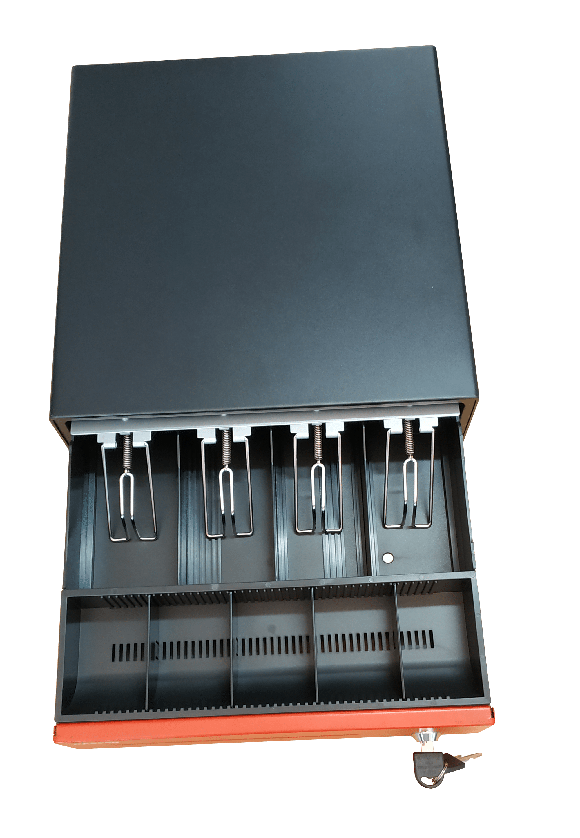 - Metal cash drawer with heavy-duty ball bearing rollers