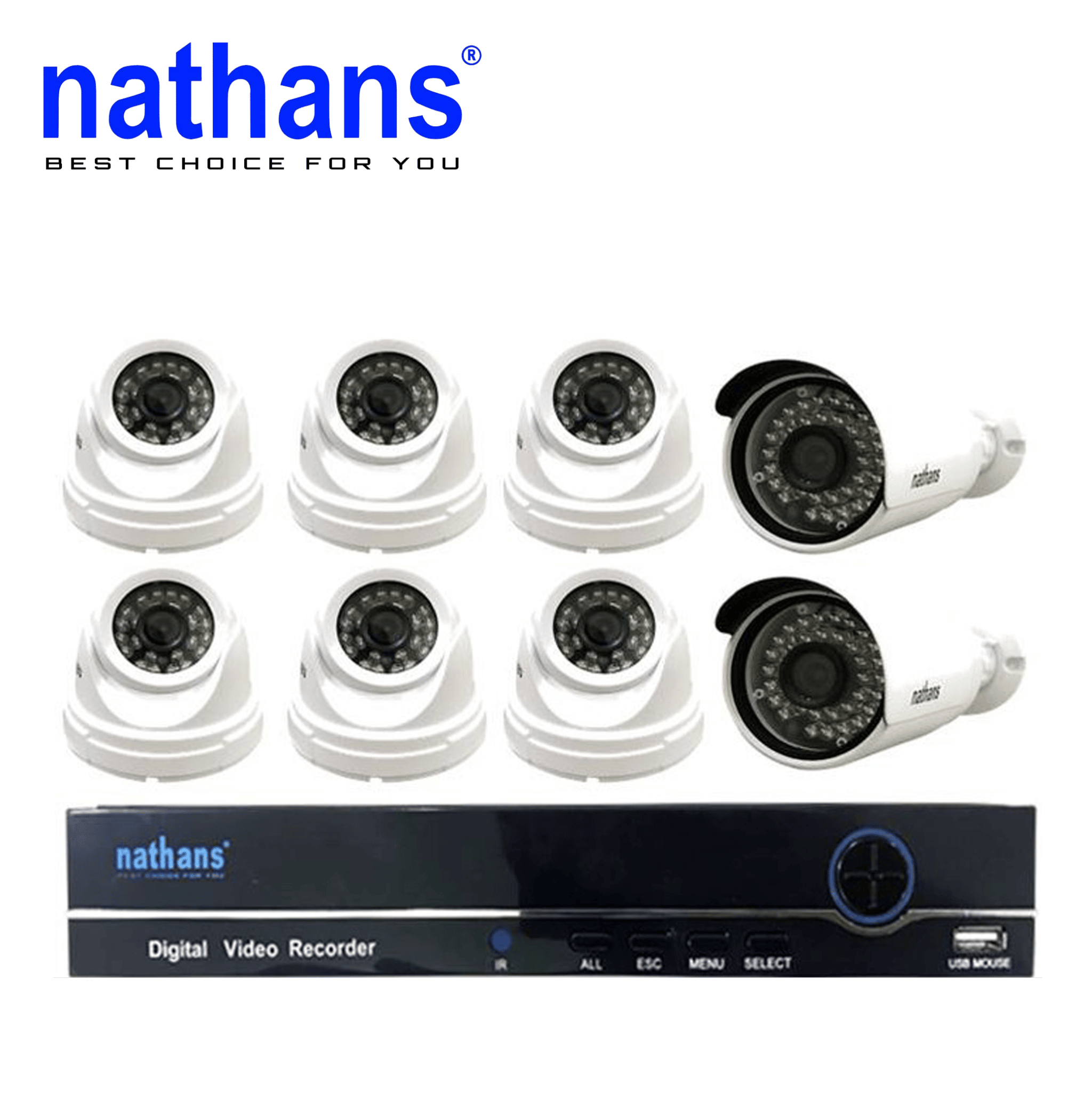 Nathans – CCTV Camera – Paket CCTV Nathans 8 Channel merupakan paket CCTV Camera yang terdiri dari 6 Camera Indoor, 2 kamera outdppr, DVR 8 Port lengkap dengan HDMI, serta Adaptor, dan Mouse. Camera CCTV Nathans sudah dilengkapi dengan Infrared, sehingga dapat dilihat dengan jelas pada keadaan gelap / malam hari. Pengawasan CCTV bisa diakses via Laptop, PC, dan Ponsel (iPhone, iPad, Symbian, Windows Mobile & Android).